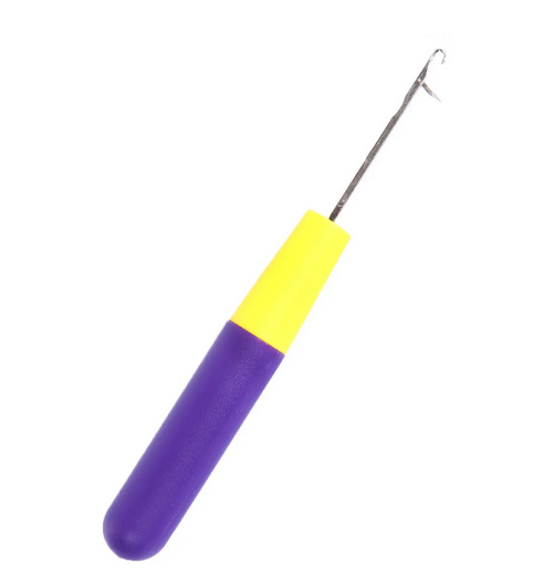 Produto em metal, utilizado principalmente para confecção de cabelos no método crochet braid. Sua ponta em formato de gancho abre e fecha, facilitando e agilizando o trabalho de colocação.