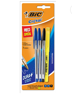 Kit Bic 3 Canetas Cristal Dura Mais + 1 Pincel Marcador De Texto