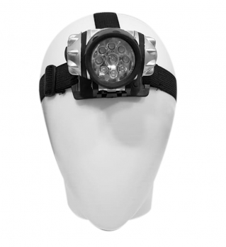 Lanterna de cabeça com 9 leds e inclinação ajustável. Funciona com 3 pilhas AAA (não inclusas).