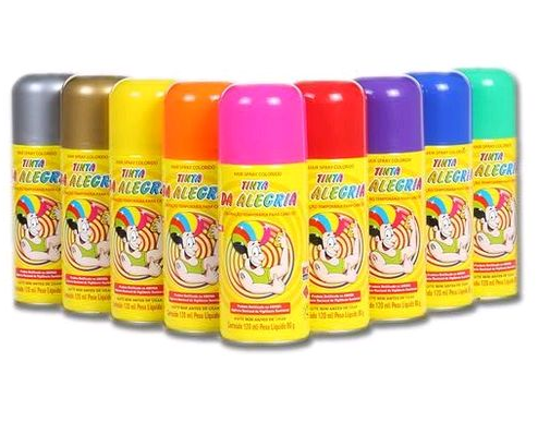 A tinta temporária para cabelos TINTA DA ALEGRIA são fabricadas em 10 cores fluoerescentes(amarelo,verde,azul,vermelho,laranja,rosa,roxo,prata,ouro e cobre)